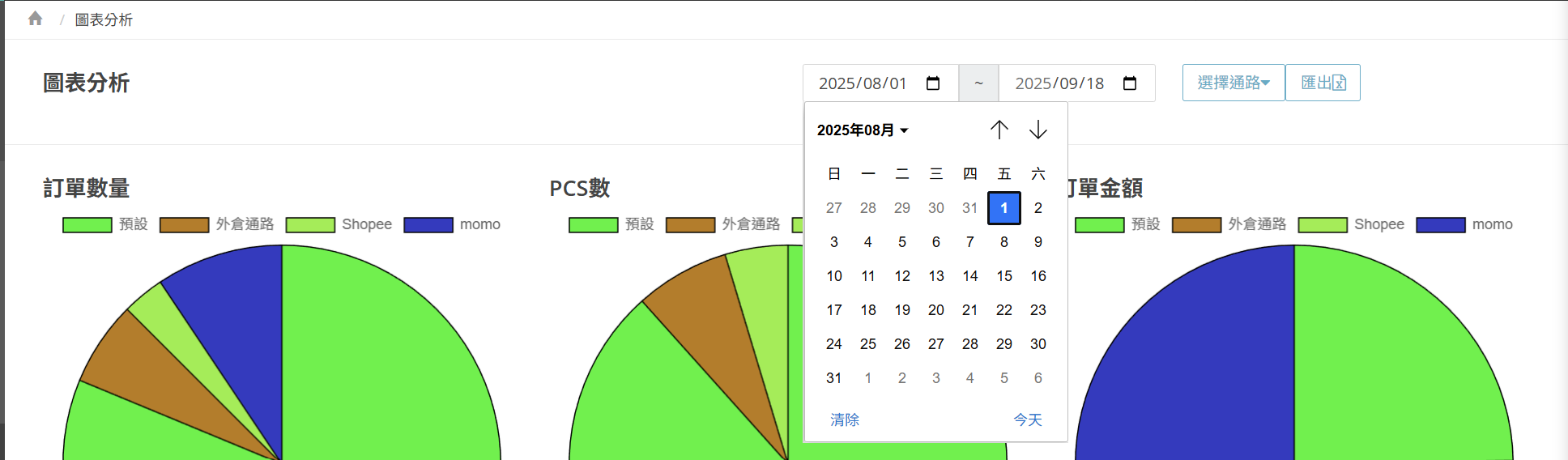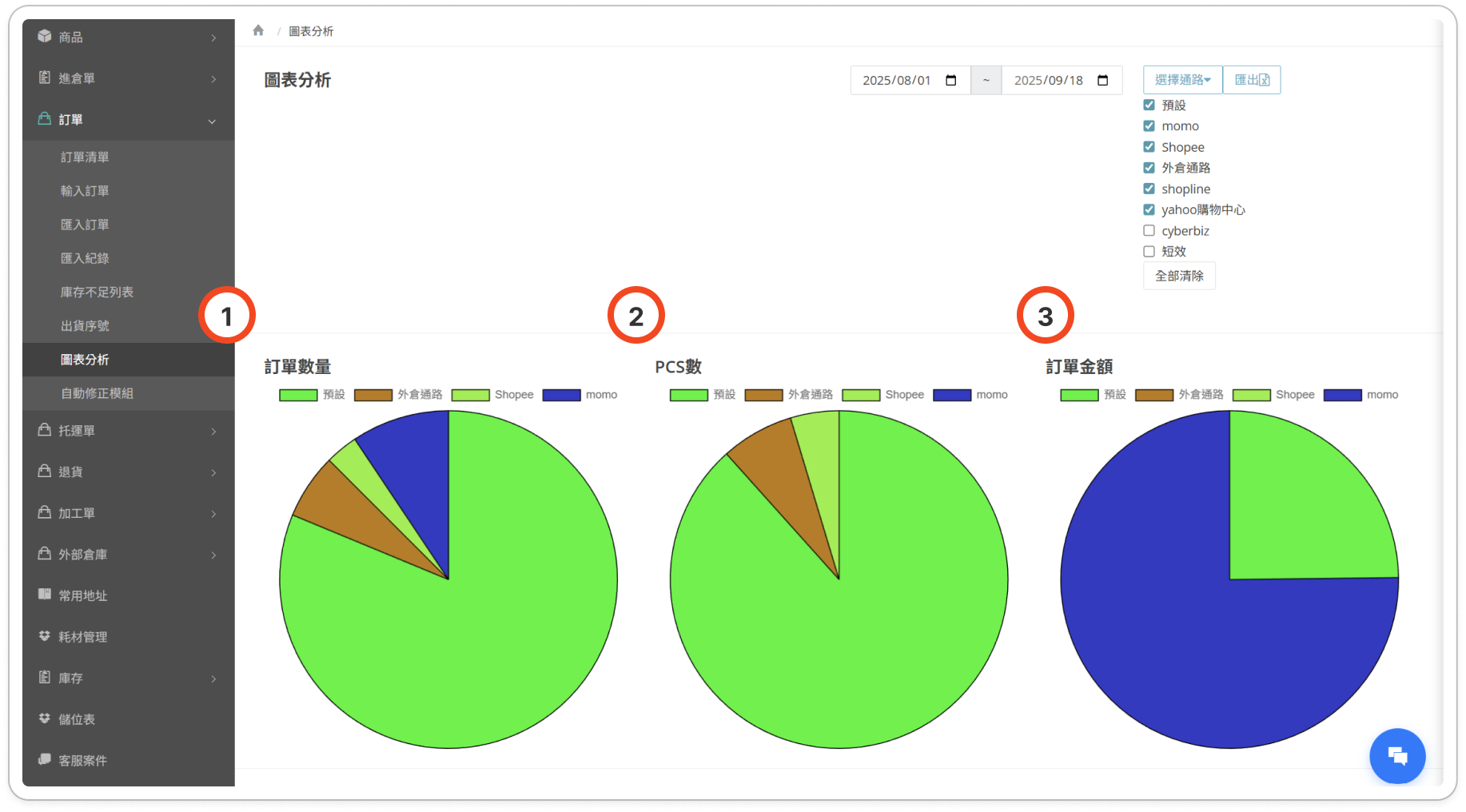 1.訂單數量:顯示設定時間段內,統計該通路在指定日期範圍內的訂單筆數