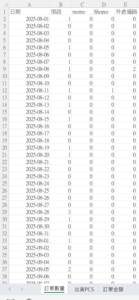 2.PCS 數(商品數量):顯示設定時間段內,加總該通路所有訂單商品的「已出貨數量」