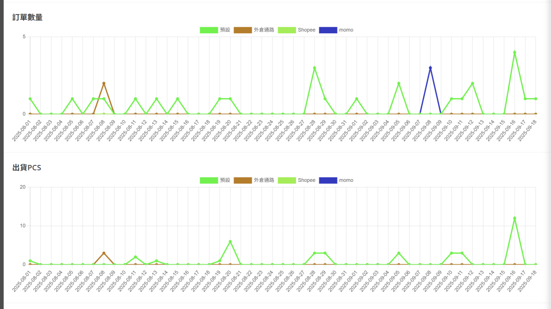 1.訂單數量:顯示所選通路在指定時間區間內的訂單數量折線圖,橫軸為日期,縱軸為數量。