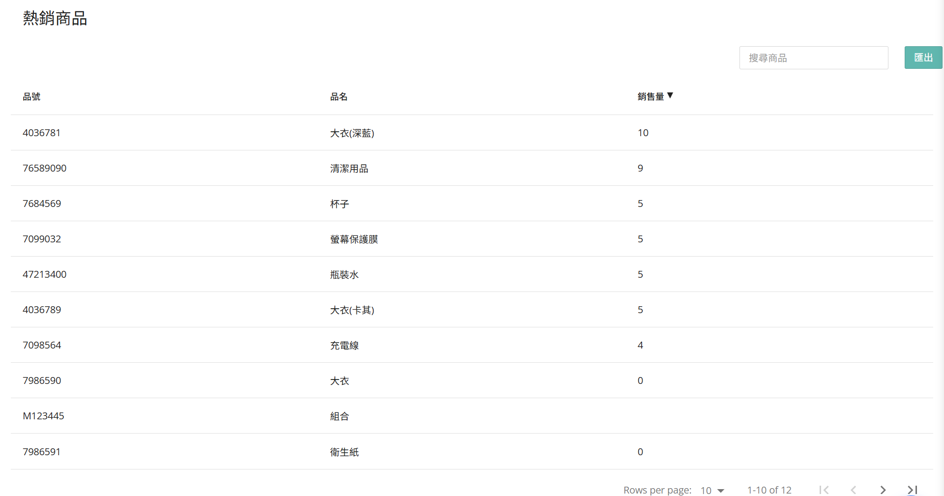 顯示所選通路在指定時間區間內的熱銷商品銷售數量,可針對單一商品進行搜尋。若需匯出報表,可點擊 [匯出] 產出 Excel 檔。