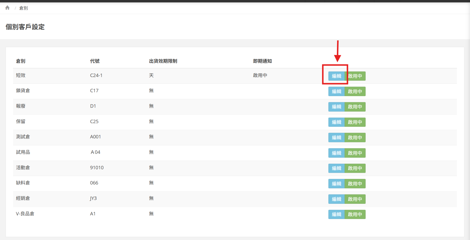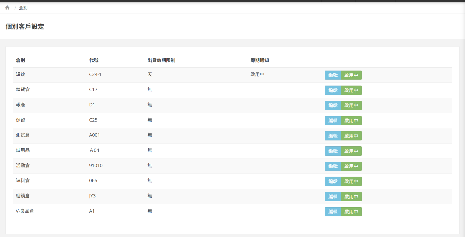 列表中呈現各倉別名稱、代號、出貨效期限制、即期通知是否啟用。