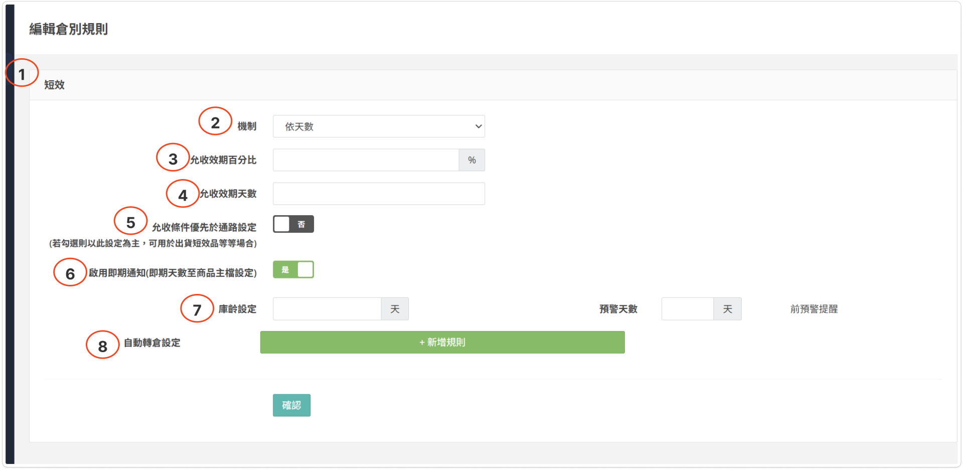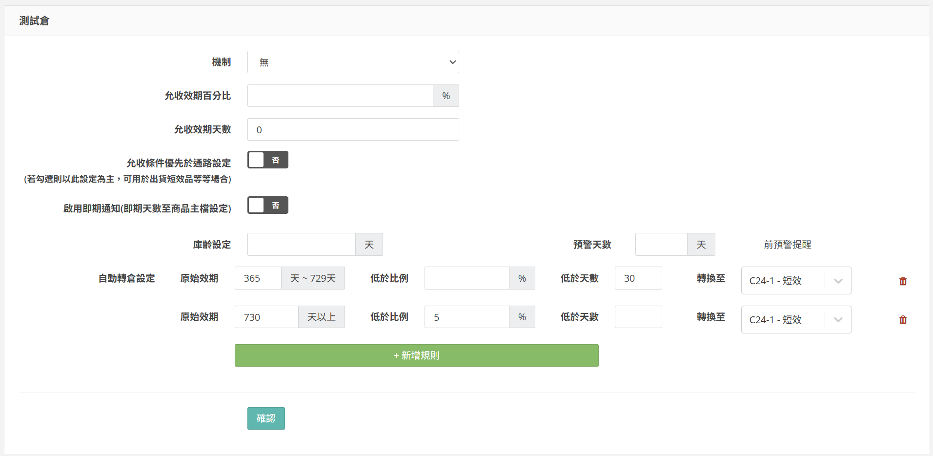 範例:商品保存期限為 12 個月,允收效期設定為 25%,則剩餘效期低於 3 個月時,不可入庫。