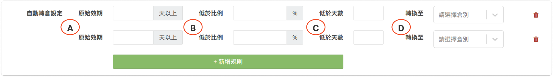 D. 轉換至:符合規則後,商品將自動轉至指定倉別(可下拉選擇或輸入)。