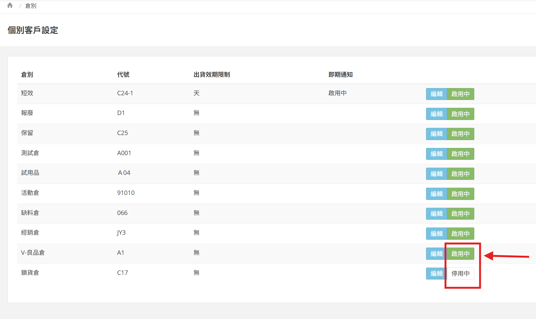 可透過點擊 「啟用中 / 停用中」按鈕,直接切換該倉別的使用狀態。