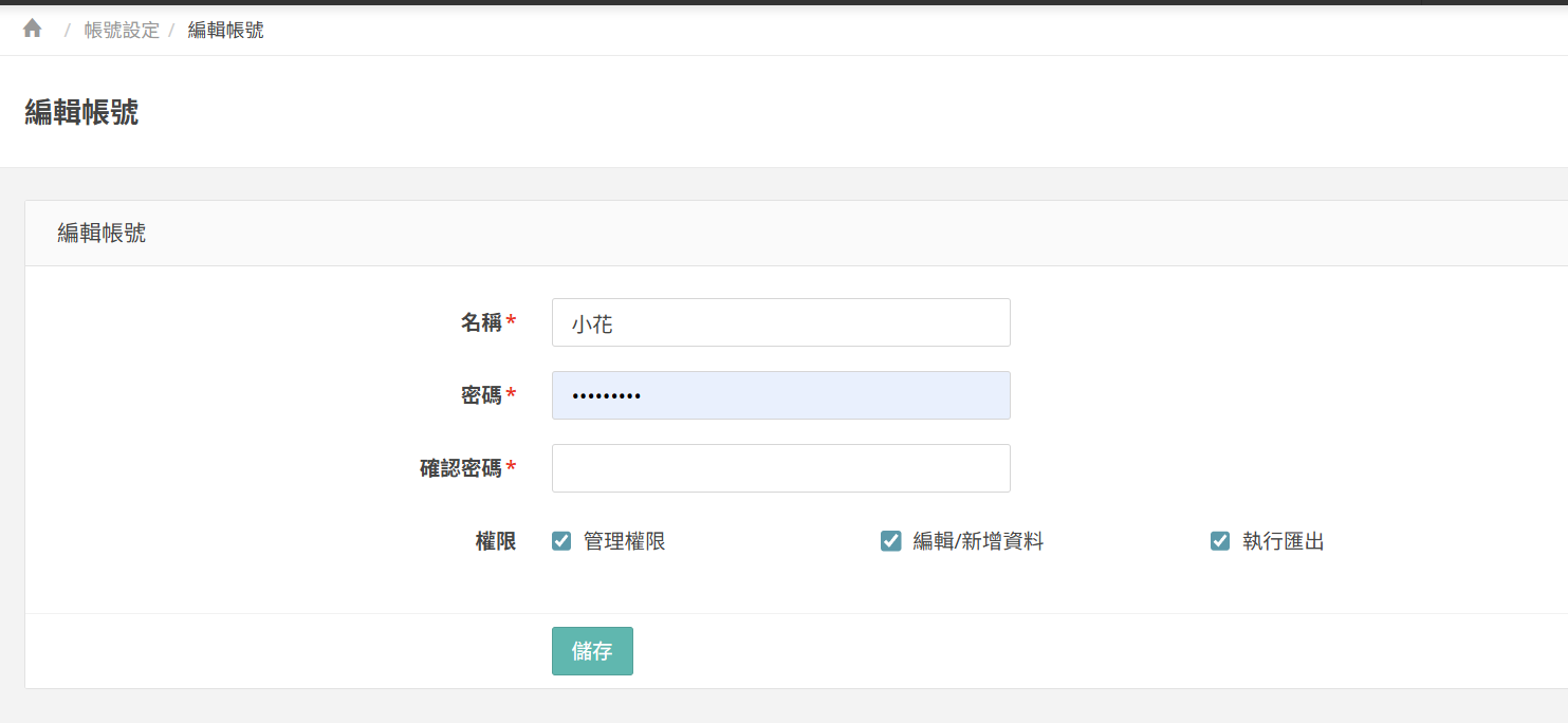 - 設定帳號權限,包含:管理權限、資料編輯與新增、匯出功能