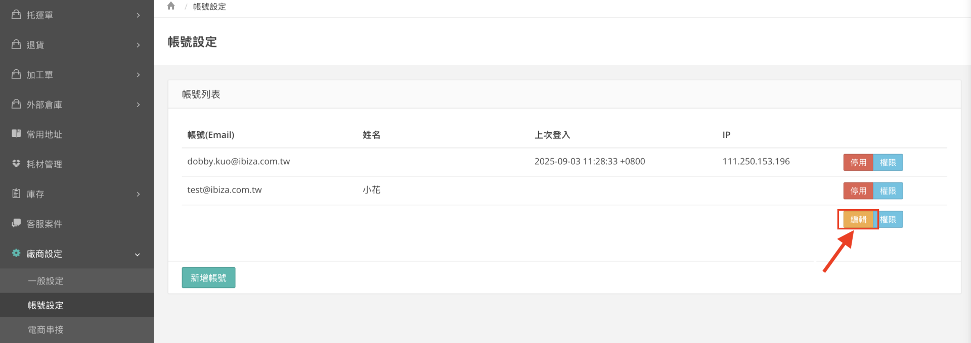 至 wms 後台「左側列表>廠商設定>帳號設定」在要修改權限的帳號點擊「編輯」按鈕