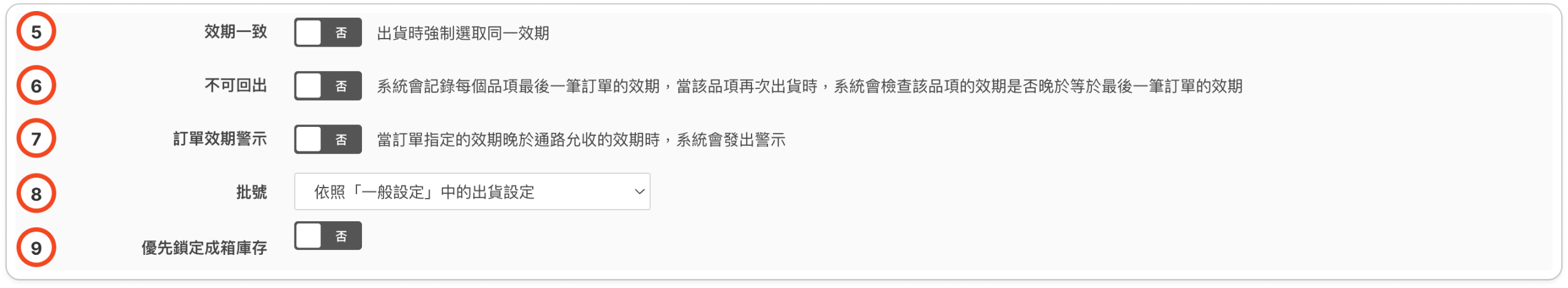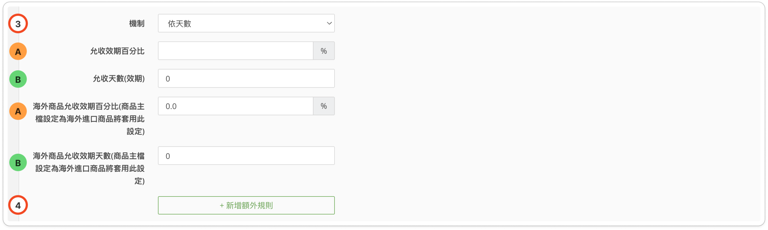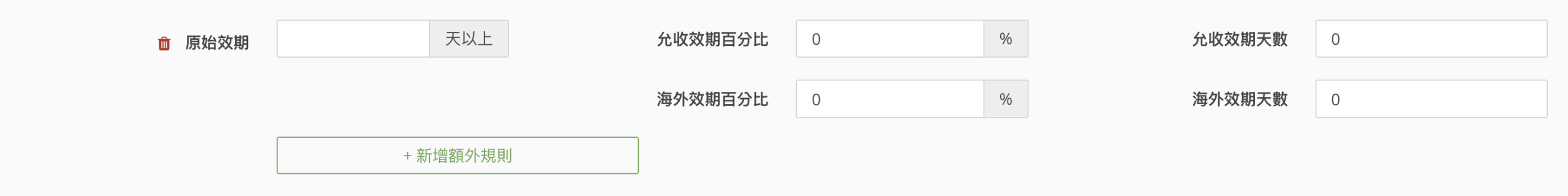 針對海外進口商品,配合「依天數」機制使用,設定商品允收的剩餘效期天數。