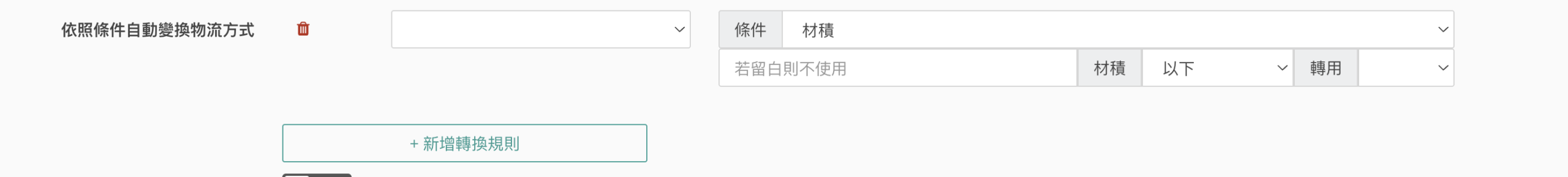 點擊新增轉換規則後,例外物流條件設定,可依照指定材積、重量、收件人姓名、收件地址自動轉換物流方式。