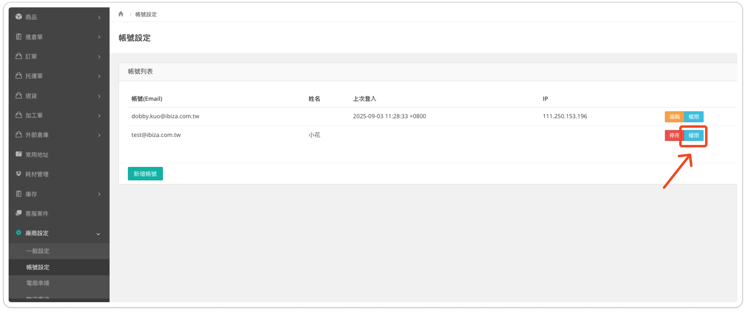 至 wms 後台「左側列表>廠商設定>帳號設定」在要修改權限的帳號點擊「權限」按鈕