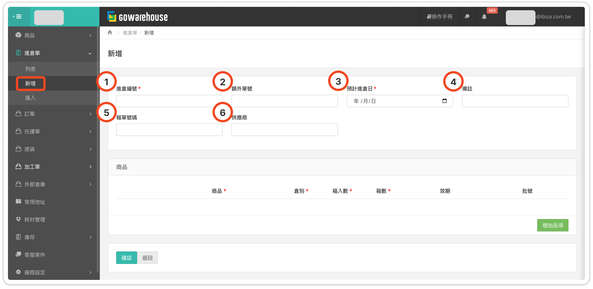 至 wms 後台「左側列表>進倉單>新增」新增進倉單