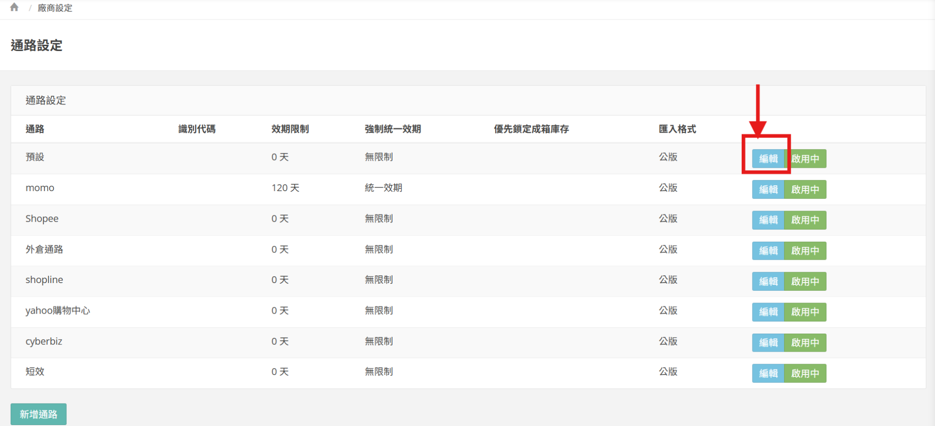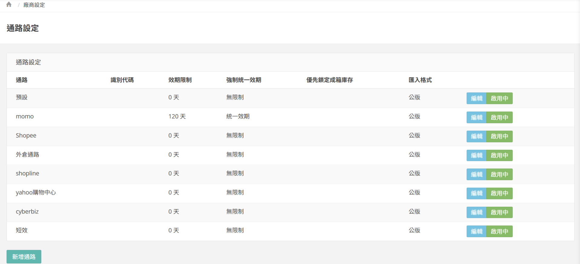 列表中呈現各通路名稱、識別代號、效期限制、強制統一效期、優先鎖定成箱庫存、匯入格式、是否啟用。
