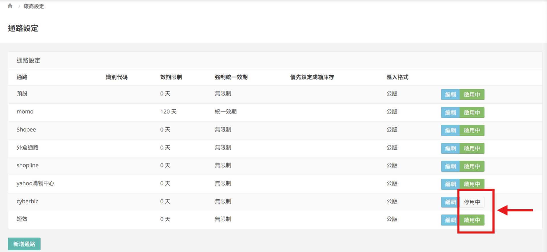 在 WMS 後台進入 「左側列表 > 廠商設定 > 通路設定」,右側會顯示該通路的狀態(啟用中 或 停用中)。