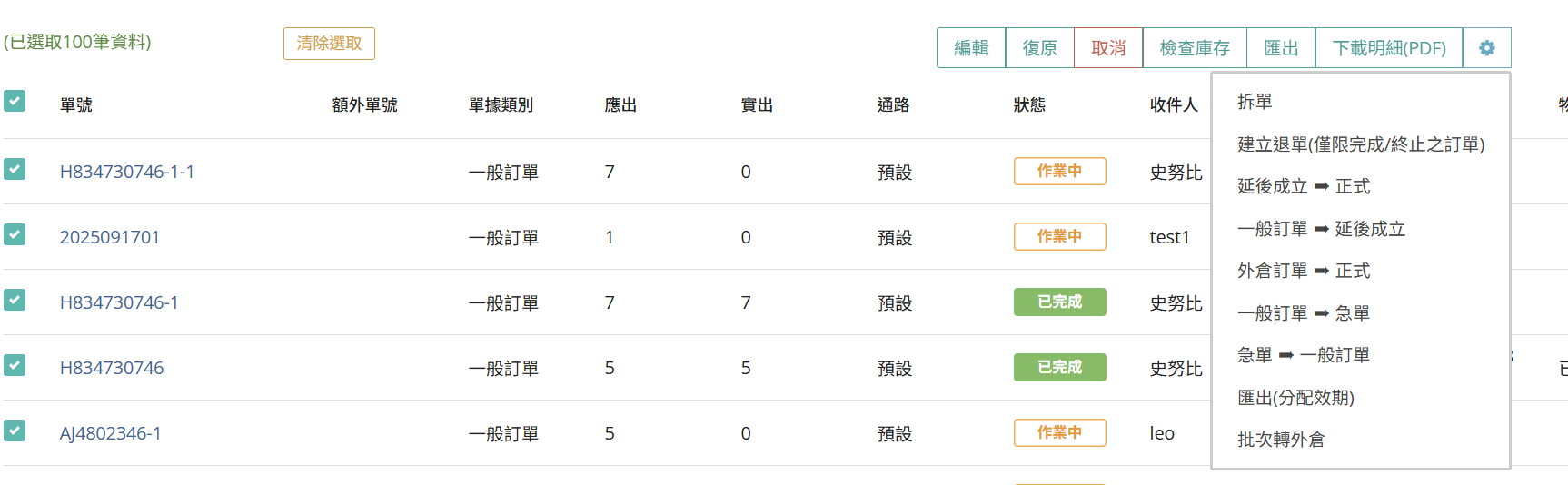 1.編輯:批次將選取的訂單進行編輯,可下拉選擇編輯”物流類型”或”通路”