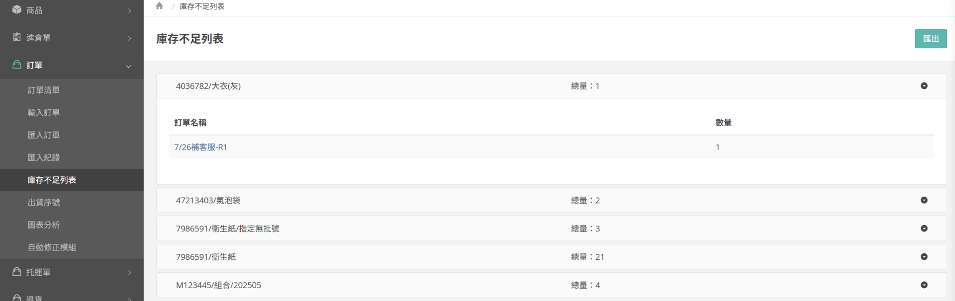 顯示各商品目前已產生訂單,但庫存不足之數量,展開細項後可查看受影響之訂單名稱與數量。