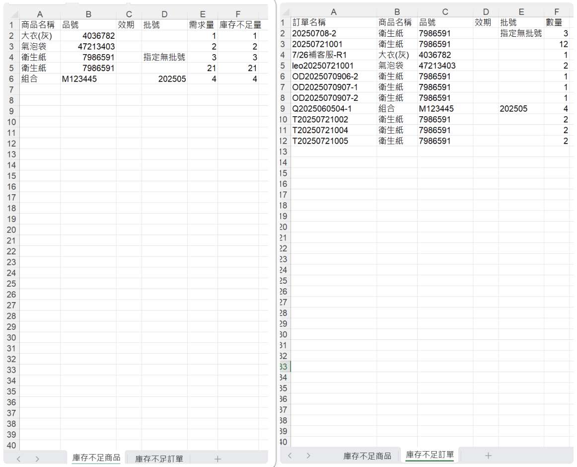 2.庫存不足訂單:呈現庫存不足的訂單名稱、商品名稱、品號、效期、批號、數量