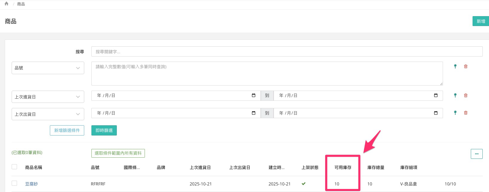 路徑:「商品>商品清單」可查看商品可用庫存量
