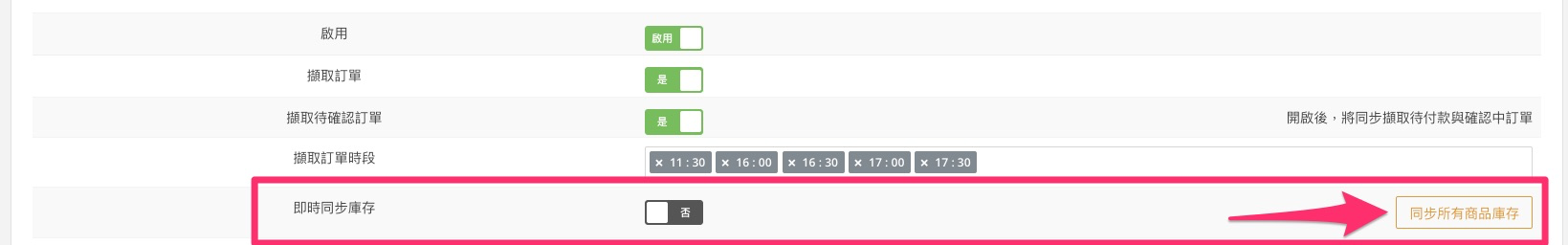 - 於後台「廠商設定>電商串接」即時同步庫存區塊點按右側「同步所有商品庫存」按鈕。