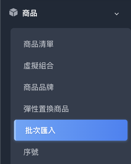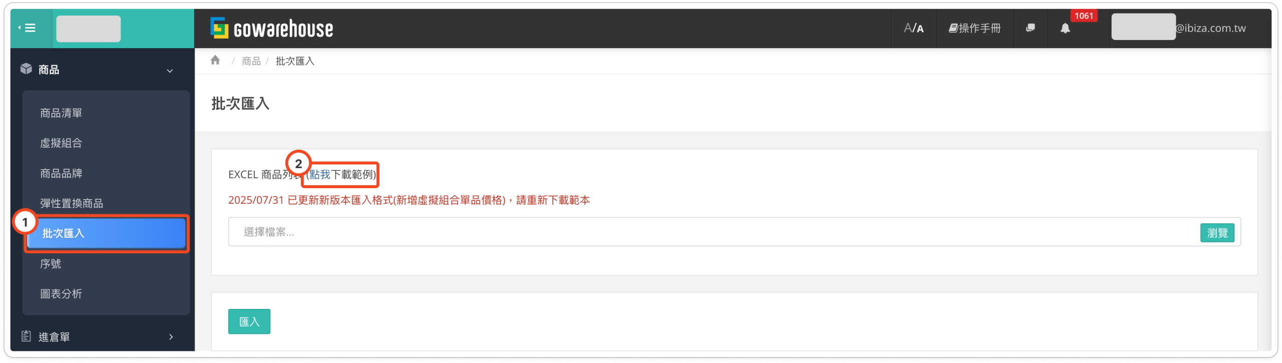 至 wms 後台「左側列表>商品>批次匯入」下載範例檔案
