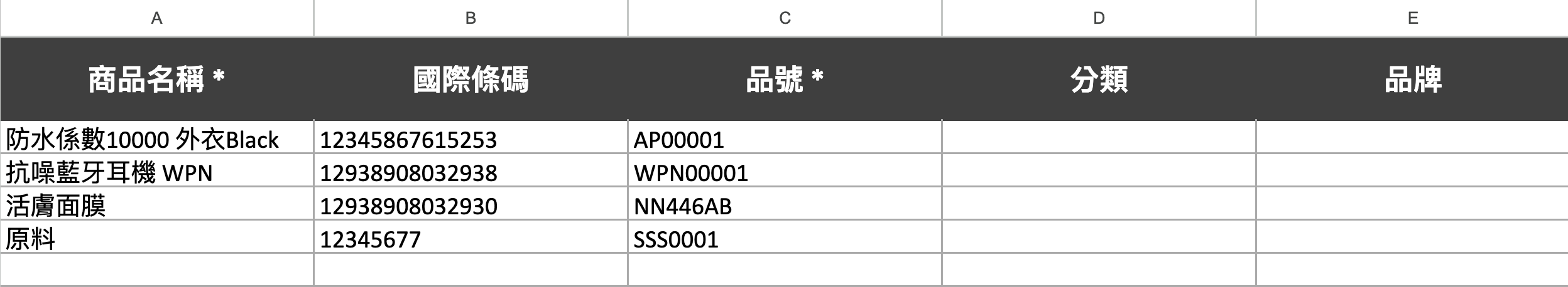 C、*品號: 請填寫文字且不可有空格(建議使用英數字),不可與其他商品重複,若品號已存在會更新該商品資料(不會新增)