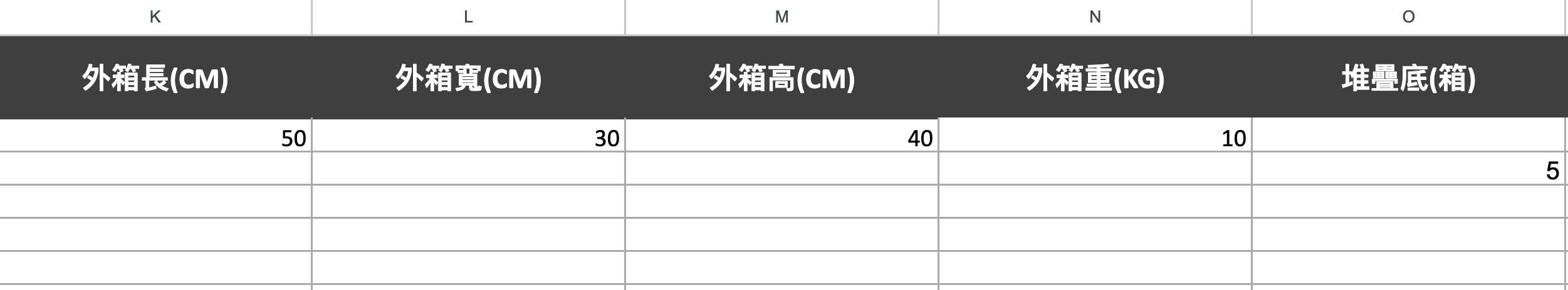 N、外箱重(KG):請填寫數字,整箱商品的重量(大單位)