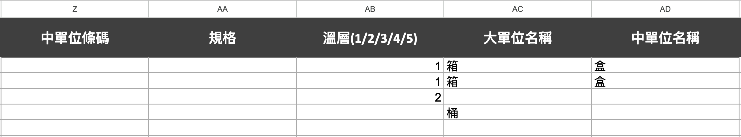 A:中單位的意思是指介於基本單位和大單位之間的包裝單位, 兩層包裝「個 → 箱」較常見,三層包裝「個 → 盒 → 箱」比較少見,如果是三層包裝才需要設定中單位