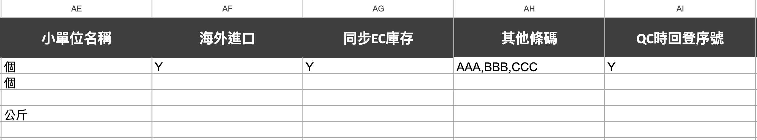 AG、同步 EC 庫存:請填寫大寫 Y 或是 N(預設為 Y)