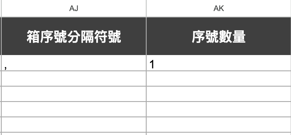AJ、箱序號分隔符號:請填寫半形符號,如:逗號 ,、分號;、直線|