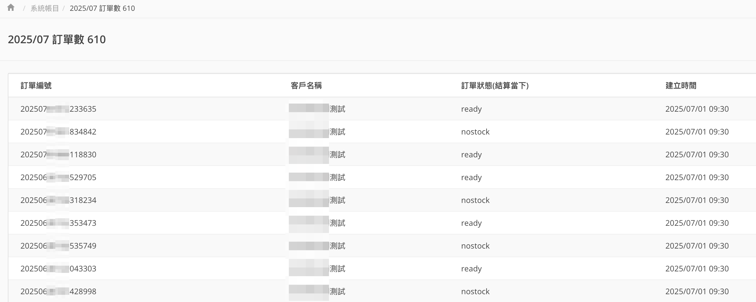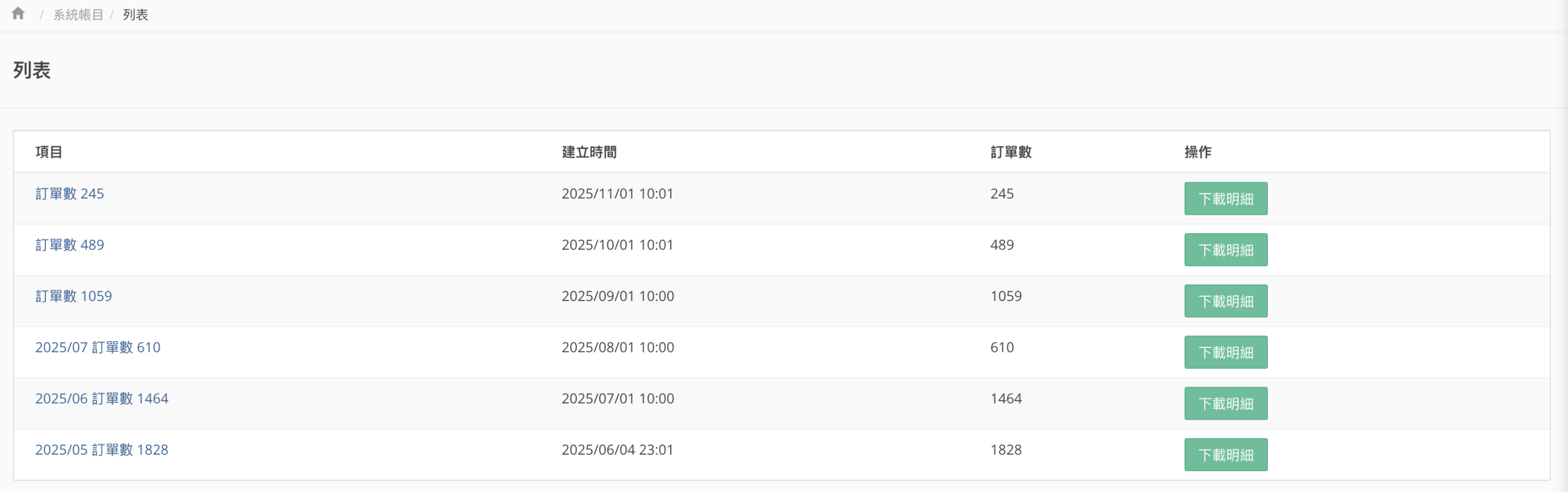 為系統自動產生的月度訂單統計報表,用於計算系統處理的訂單數量,列表呈現倉庫訂單數,利於倉庫與 GoWarehouse 核對帳款