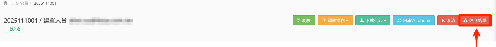 強制將進倉單狀態更新為「已入庫」,僅有進倉單狀態為「已驗收」、「處理中」才可操作。