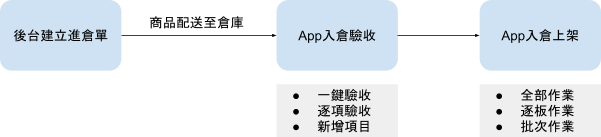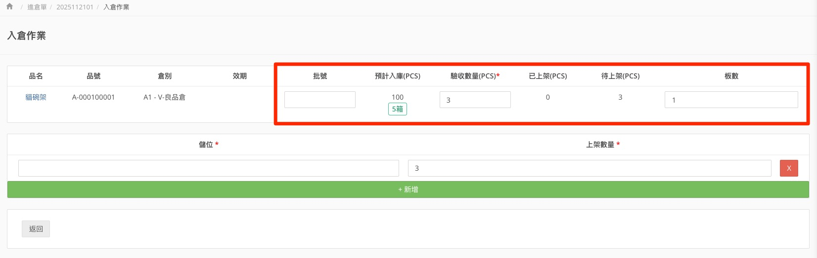 *提醒:需操作上架作業才能完成進倉作業。尚未上架前,可重複驗收,更改驗收量。