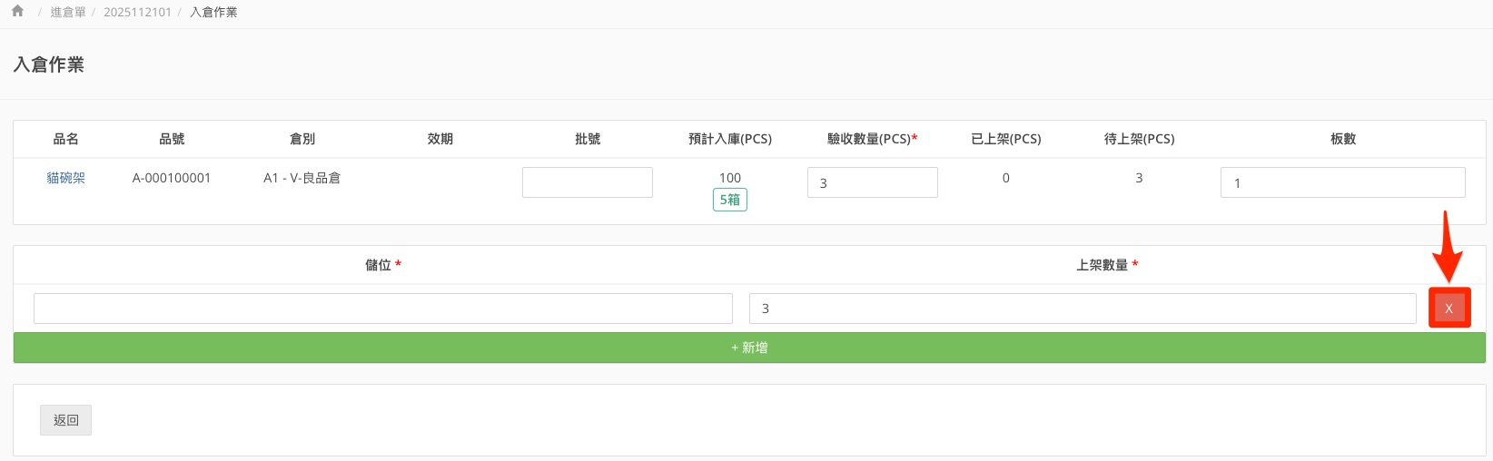 若僅做驗收尚未完成上架,請點擊「X」按鈕刪除上架數量。
