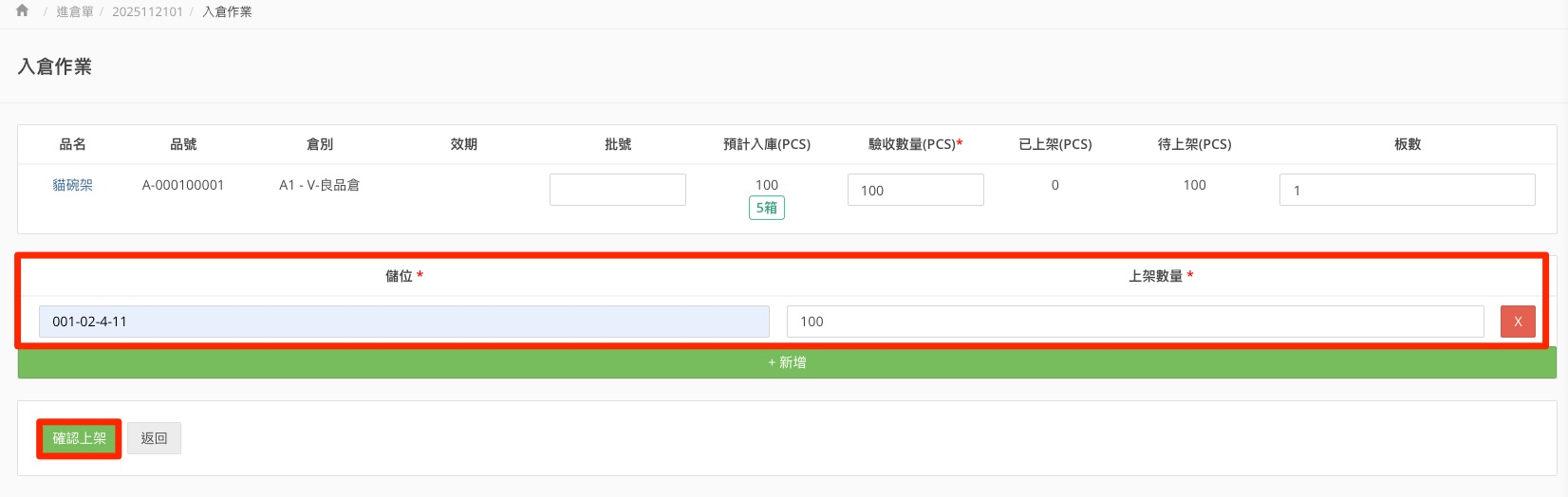 如果一併完成上架,請輸入儲位及上架數量,接著點按「確認上架」,即完成驗收上架作業。