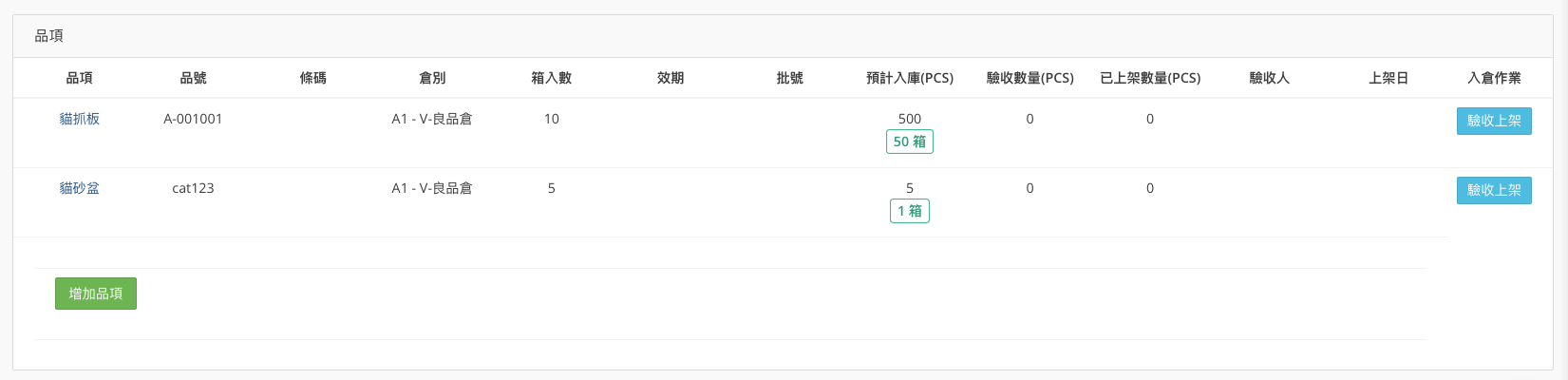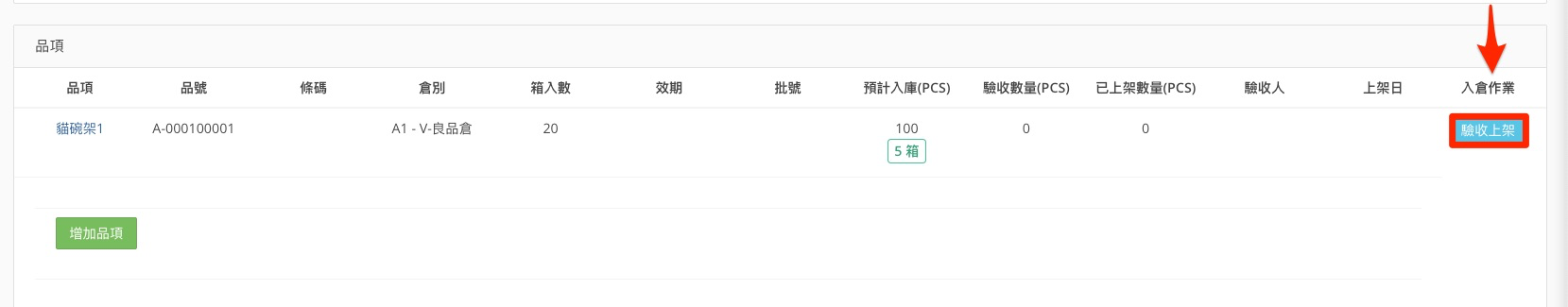 如果貨物送達以後,有多出的品項,那可以在尚未完成入倉作業之進倉單,自行增加品項。請點擊「增加品項」按鈕: