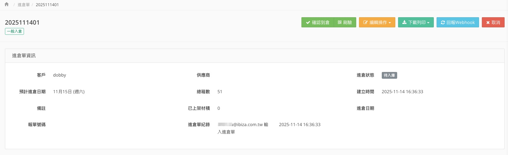 點擊清單的進倉編號,即可查進入詳細頁面查看進倉單資訊