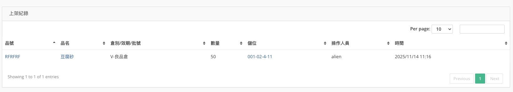 此欄位會列出個別品項的上架紀錄,包含倉別/效期/批號、數量、儲位、操作人員及時間。