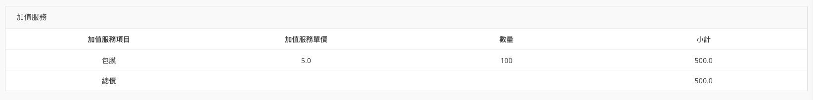 如果客戶有額外要求的包裝、貼標、檢驗等服務,可於此編輯、修改或刪除加值服務。