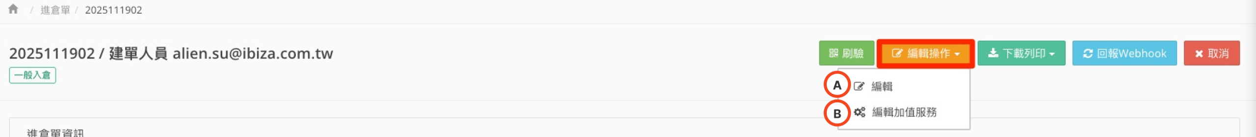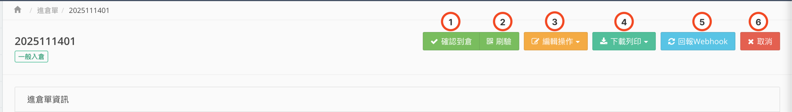 進倉單詳細頁面可以管理單一進倉單,在此頁面您可以查看進倉單的完整資訊、管理品項、追蹤上架記錄、管理產品序號,以及編輯加值服務。