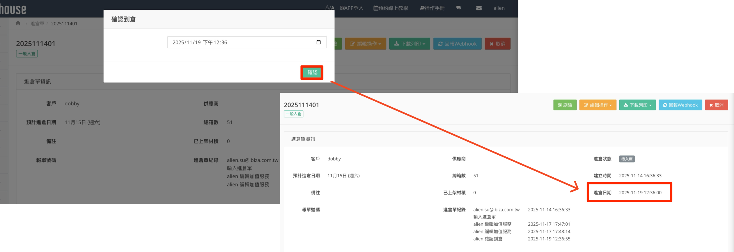 點按「確認到倉」按鈕後,請於彈窗點按「確認」,後續進倉單資訊便會紀錄「進倉日期」,商品以此時間開始計算倉租。