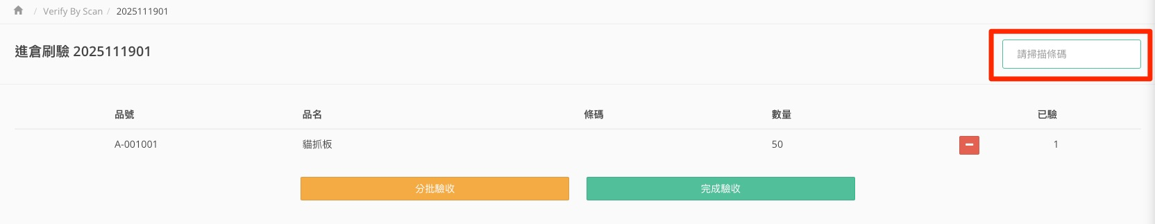 如果品項數量多,需要快速作業時,可以點按「刷驗」按鈕,進入以下頁面後,可以於右上角輸入或刷取商品品號/條碼,快速驗收品項。