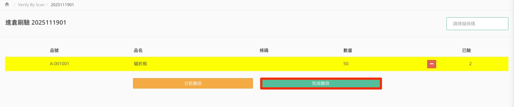 商品正確則該會以商品黃底做提示,驗收完成後請點按「完成驗收」。