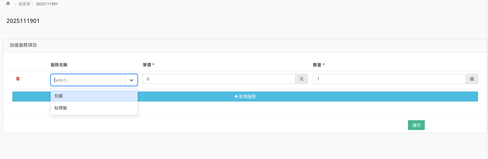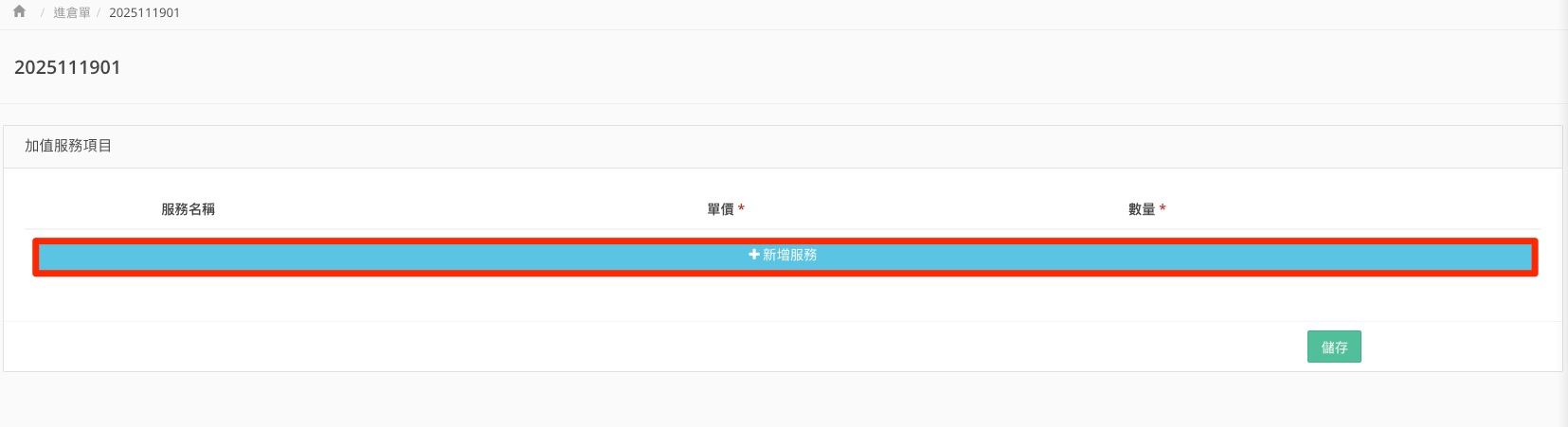 在進倉單點按「編輯加值服務後」,會進入以下頁面,點擊「新增服務」