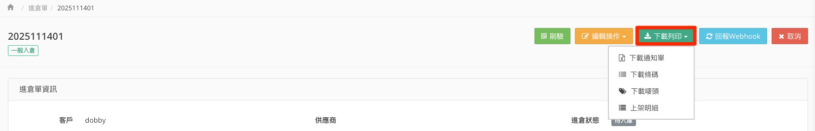 下載列印選項包含下載通知單、條碼、嘜頭、上架明細