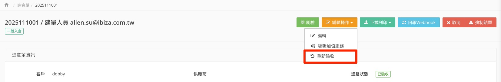 如果驗收後數量有誤,可以點按「編輯操作>重新驗收」