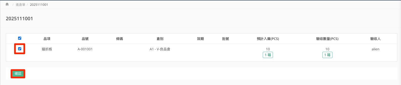 勾選要重新驗收的品項,再點按確認。接著驗收數量會歸零,而進倉單則會退回「待入庫」狀態。