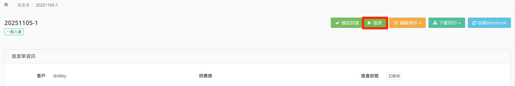 *注意:已取消的進倉單,可點按「復原」功能恢復進倉單。