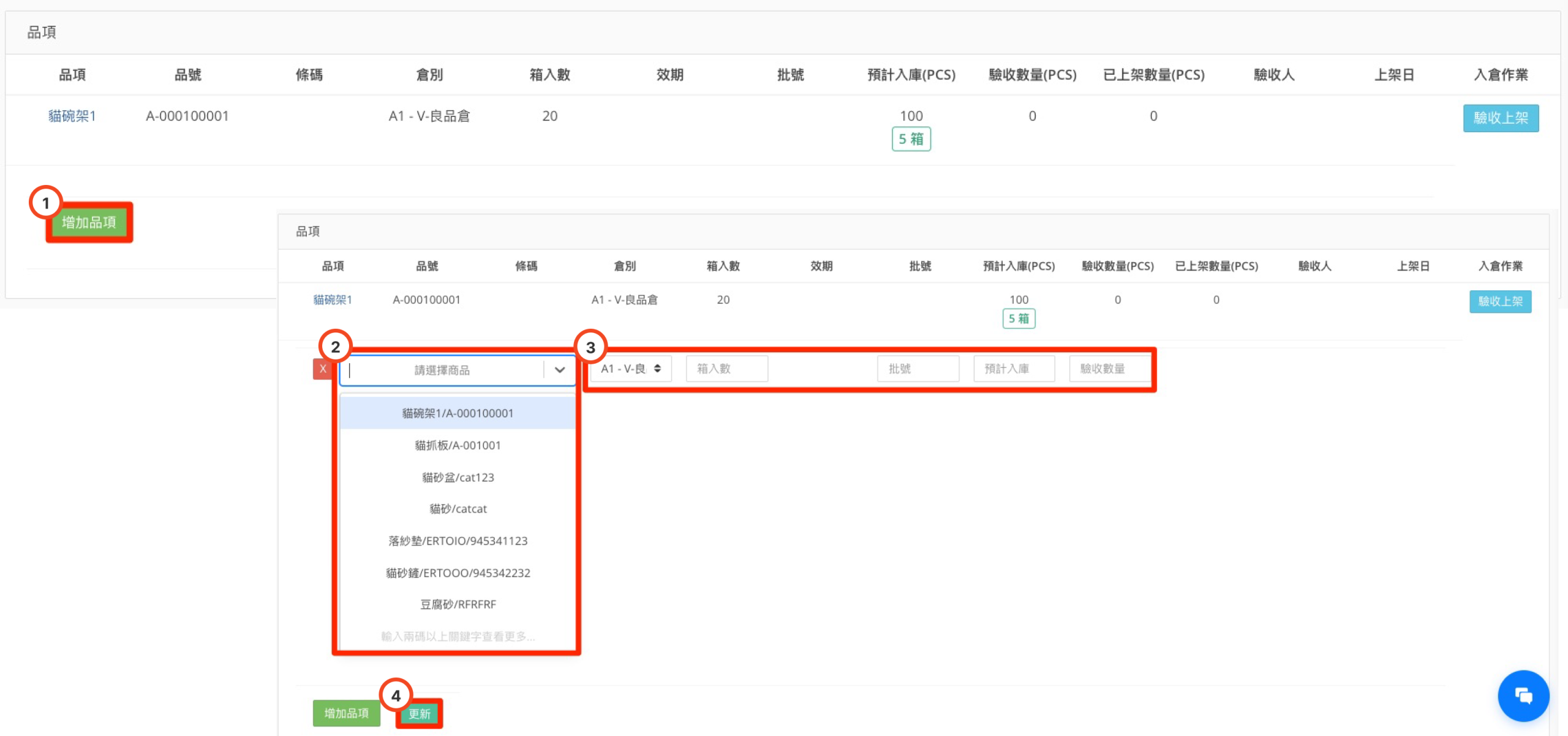 接著下拉選擇商品或輸入搜尋商品,並且選擇倉別,依序輸入箱入數、效期、批號、預計入庫(PCS)、驗收數量(PCS),再點按下方「更新」按鈕即可。