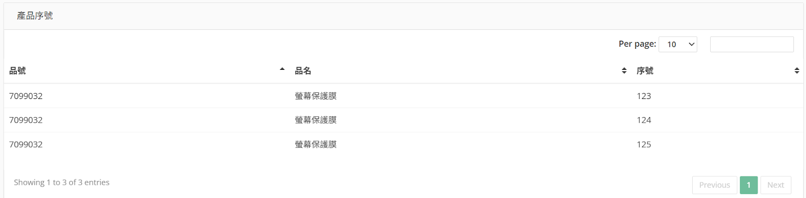 呈現進倉時各商品序號登入的資訊,登入操作方式請參考:(入倉序號登錄文件連結)