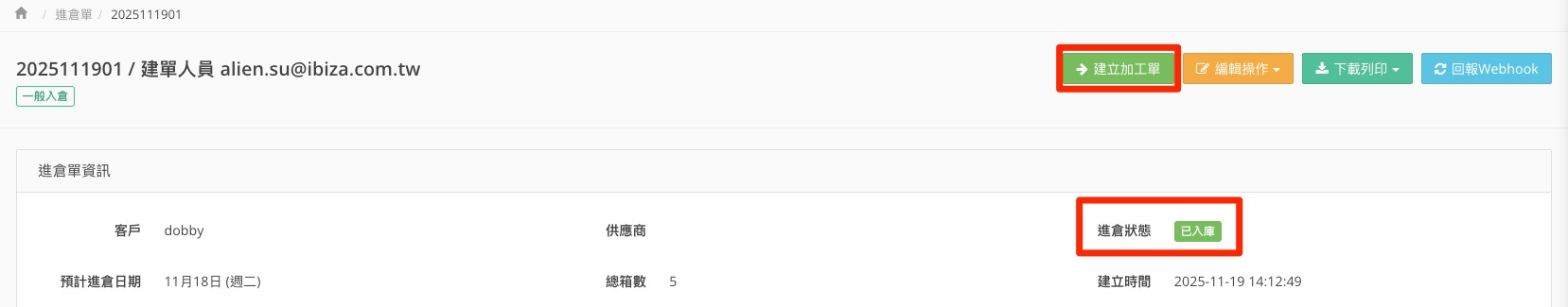 當進倉單狀態為「已入庫」時,才能針對該筆進倉單商品建立加工單。