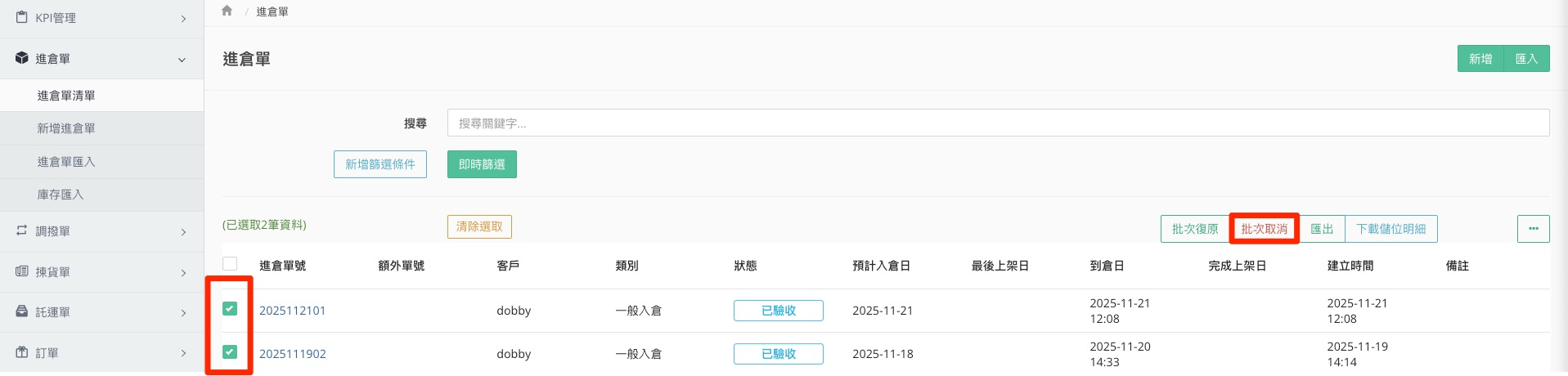 A:您可以在後台「進倉單>進倉單請單」頁面勾選要取消的訂單,接著點擊「批次取消」按鈕來操作。