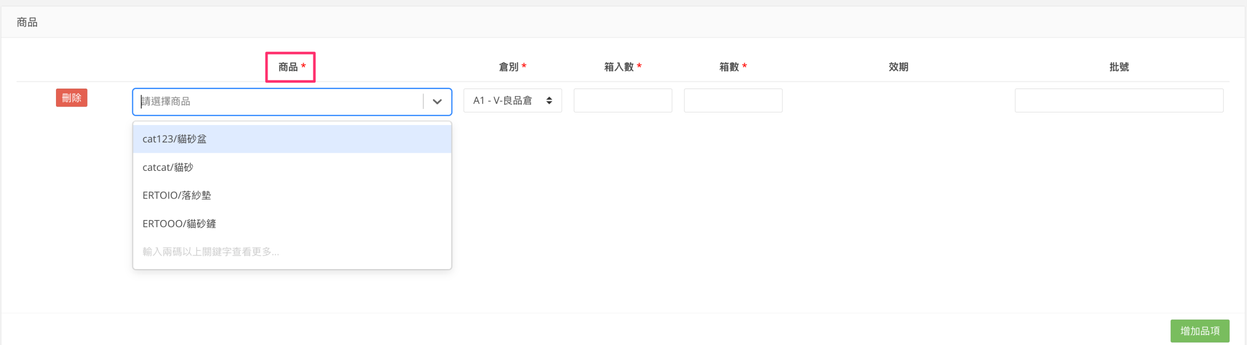 支援下拉選擇商品、商品名稱、條碼、品號
